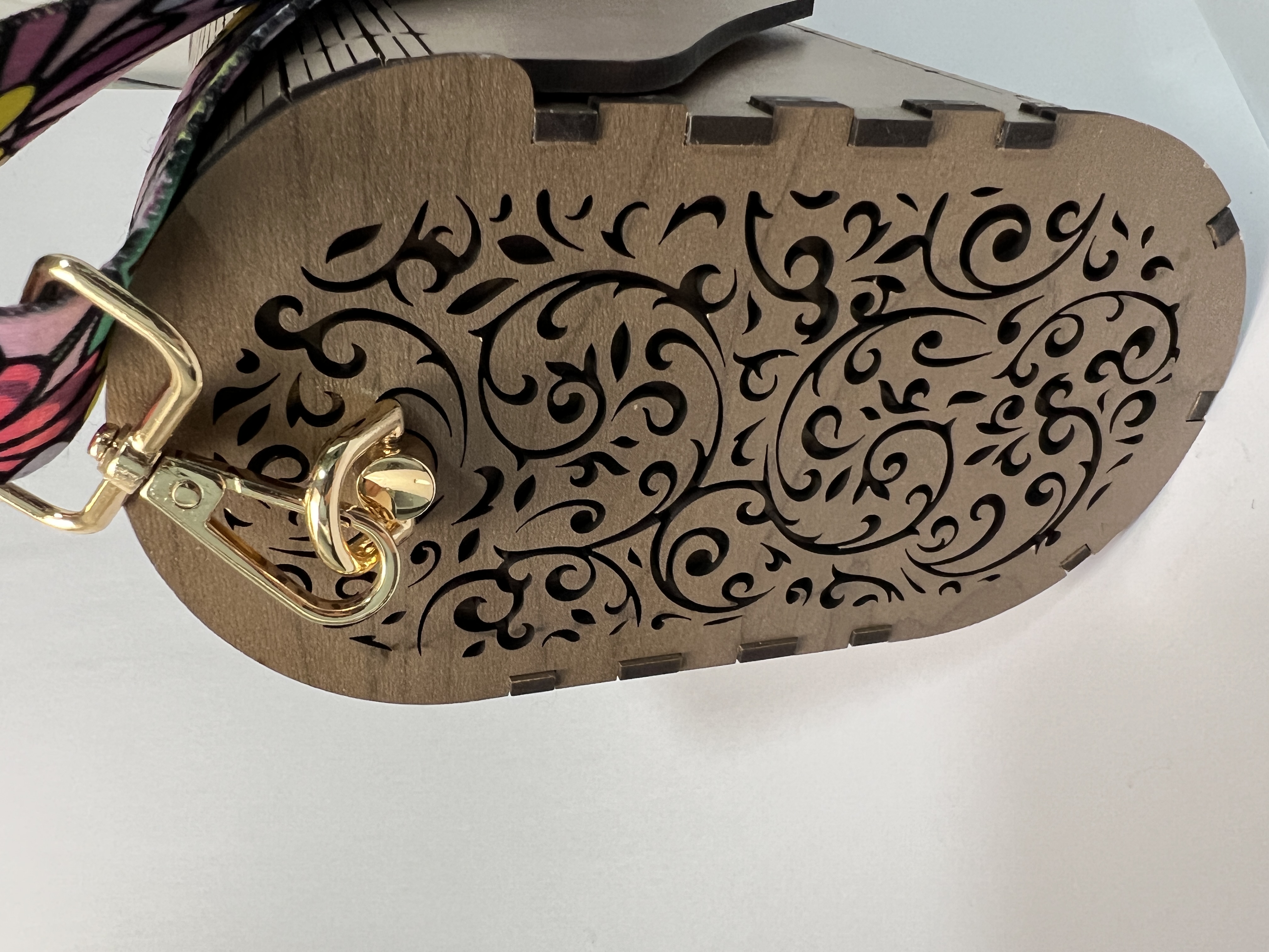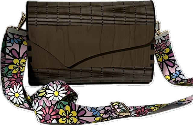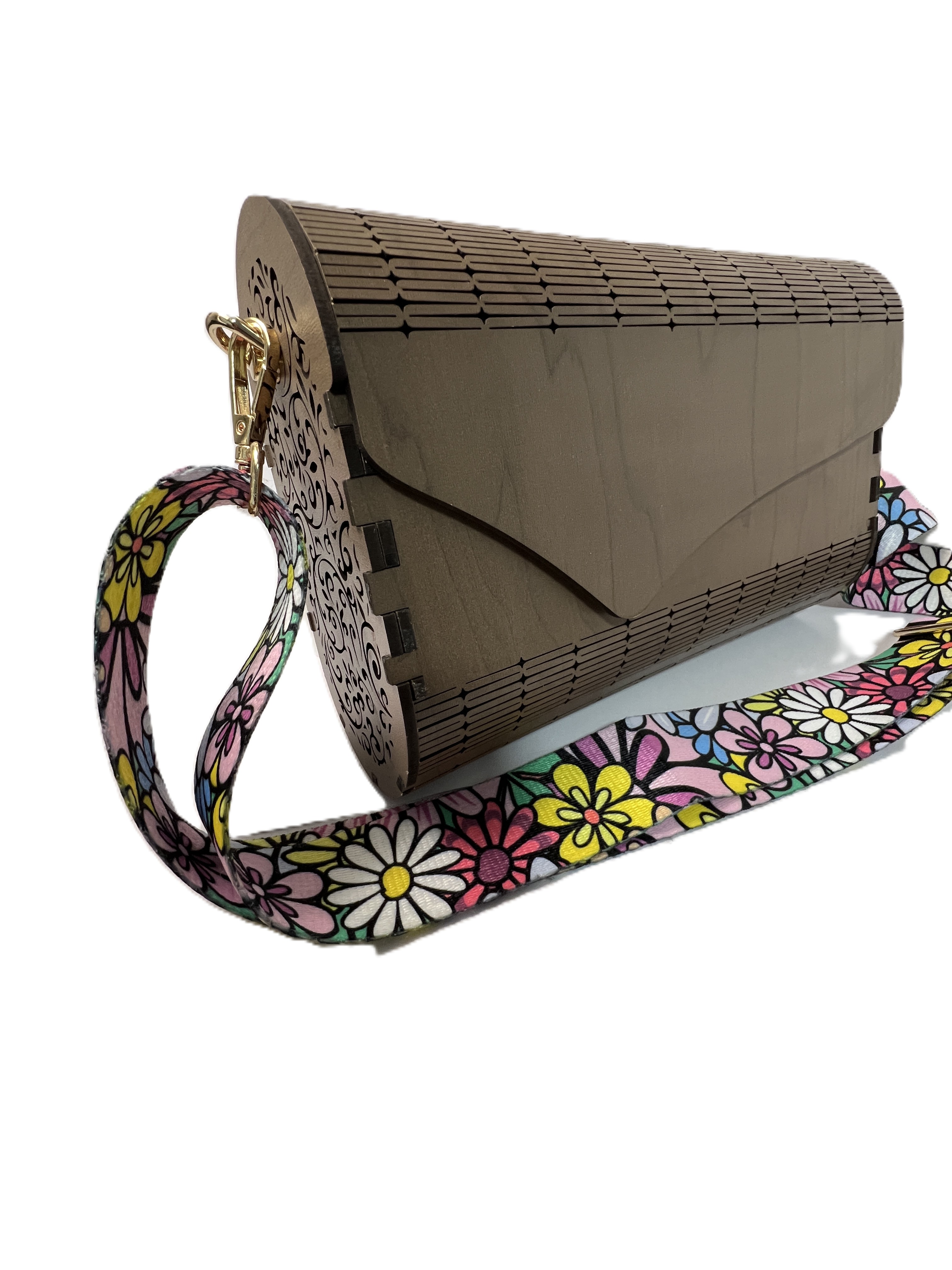 Handcrafted Design, Unique wooden handbag featuring intricate laser cut pattern detailing and elegant asymmetrical flap closure for distinctive style.